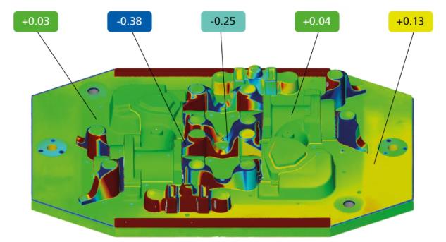Wilhelm Funke選擇使用搭配ZEISS INSPECT軟件的自動化設備SCANBOX進(jin)行(xing)自(zi)動(dong)檢(jian)測(ce)和(he)數(shu)字(zi)化(hua)處(chu)理(li)。高(gao)精(jing)度(du)和(he)可(ke)溯(su)源(yuan)的(de)測(ce)量(liang)結(jie)果(guo)確(que)保(bao)了(le)即(ji)使(shi)是(shi)微(wei)小(xiao)的(de)偏(pian)差(cha)也(ye)能(neng)快(kuai)速(su)識(shi)別(bie),從(cong)而(er)在(zai)必(bi)要(yao)時(shi)可(ke)快(kuai)速(su)采(cai)取(qu)應(ying)對(dui)措(cuo)施(shi)。工(gong)具(ju)和(he)模(mo)型(xing)通(tong)過(guo)與(yu)CAD數據進行彩色表麵對比,進行了有針對性的校正。此外,還要檢查半模、型芯和滑塊的配合情況。在試模過程中,計量人員會檢查鑄件的形狀和尺寸精度。在比較部件時,高檢測重複性至關重要。