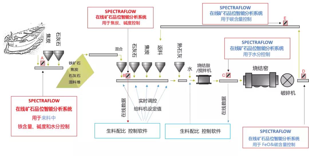 SpectraFlow在線礦石品位智能分析係統實時檢測分析物料成分,並自動控製調整相關參數,克服了傳統檢測方法的不足,是實現智能製造、降本增效的有效途徑。他除了可以控製混料堿度之外,它對於監測物料品位、水分。碳、氧化亞鐵等的含量的調控,也起著關鍵的作用(如下圖,ABCDE即為係統的可安裝位置),同時JFE鋼廠中也有在其他位置的安裝實例,本文篇幅所限,暫隻為大家呈現一個堿度控製的結果示例。