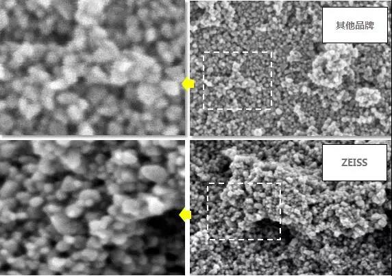 材料表麵組織形態越精細,弱信號的檢測靈敏度對FE-SEM的成像影響越大,以圖6的Fe3O4磁性粉末為例,20萬倍的情況下還看不出來ZEISS與其他品牌之間有很大的區別,但將圖中微區進一步放大,很明顯ZEISS FE-SEM在噪點的控製上表現更好。